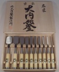 店頭展示している商品ですので、木箱に日焼け等ある場合がございます。 予めご了承下さい。 柏印で有名な播州三木の鑿鍛冶、大内鑿製作所 10本組(3mm・6mm・9mm・12mm・15mm・18mm・24mm・30mm・36mm・42mm) 鋼:白紙2号 柄:グミ柄 ※販売ごとに店頭在庫は入れ替わりますので、写真はイメージです。
